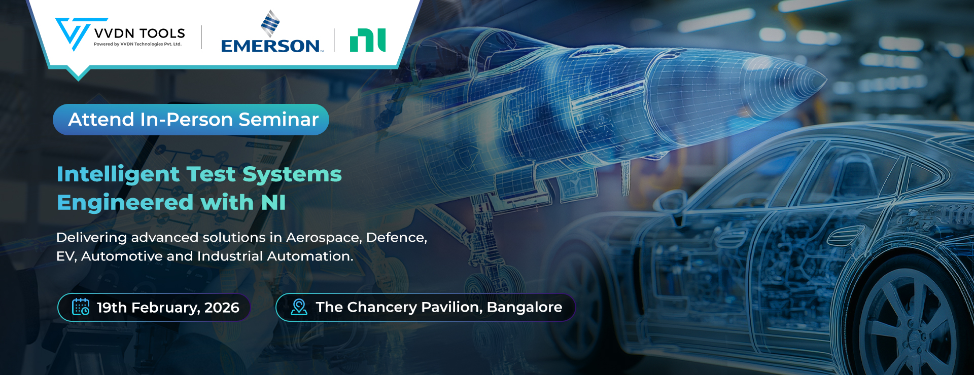 Join us for a one-day immersive session as VVDN Technologies, in collaboration with NI (National Instruments), brings you a comprehensive walkthrough of modern, scalable and intelligent test systems. Explore how these solutions enable high-performance validation, automation, and measurement across industries such as Aerospace & Defence, Automotive, EV and Industrial Automation.